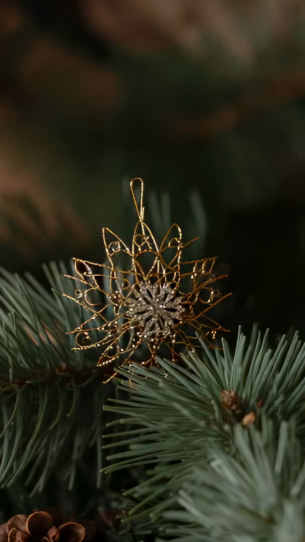 AI Generated Video. Hand placing gold filigree snowflake ornament onto fir branch, captured in vertical video for mobile viewing. Close-up framing highlighting metallic shimmer, glitter center, delicate openwork, and soft evergreen needles with pinecone accent. Shallow depth of field creating warm bokeh background, conveying cozy holiday mood. Perfect for holiday marketing, social media reels, Instagram Stories, TikTok, online store product listings, DIY craft tutorials, seasonal blog headers, greeting card animations, lifestyle commercials. Usage tips: trim clip to 6-15 seconds for social platforms, add soft instrumental music and gentle ambient sound, apply slight color grading to boost warmth and gold tones, overlay short text captions for call-to-action. Ideal for Christmas, winter, festive decor, home styling, craft and ornament tutorials, gift guide visuals.