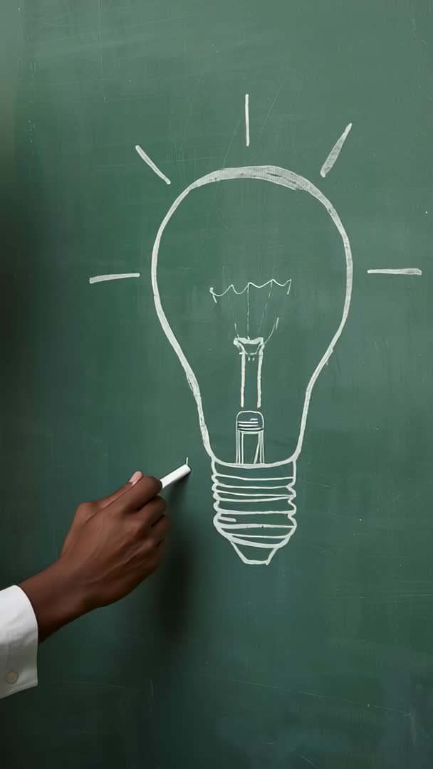 AI Generated Image. Vertical video showing hand sketching large lightbulb on chalkboard with white chalk, suggesting idea generation and creative thinking. Scene fitting classroom teaching, team brainstorming, design workshops, and entrepreneurship content. Content working well for social platforms in 9:16 format, including Reels, TikTok, Instagram Stories. Suiting startup pitch videos, innovation workshops, educational tutorials, blog headers, presentation slides, marketing campaigns, explainer videos. Composition leaving negative space for overlay text, logos, captions, or lower-third graphics. Cropping to 9:16 and animating chalk stroke for reveal effect helping create engaging intros. Color palette focusing on deep green board and white chalk, creating authentic school or studio atmosphere.