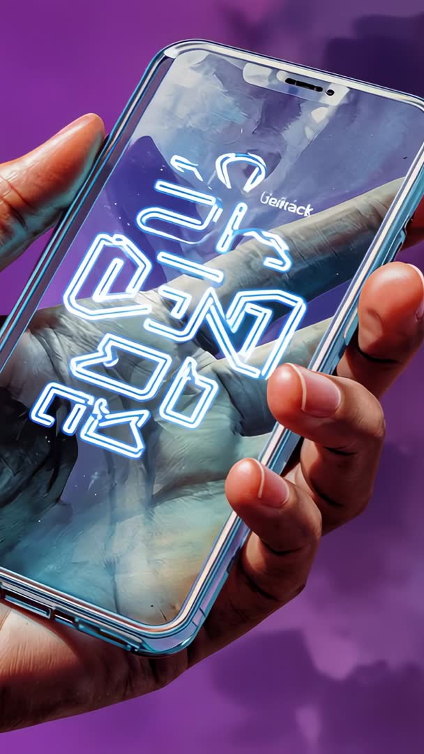 AI Generated Video. Vertical video clip showing hand tilting phone close to camera while glossy display reflecting neon palm graphic against purple backdrop. Clip highlighting reflective screen, tight grip, and dynamic tilt movement for dramatic tech shot. Ideal for app promo, product demo, social media story, mobile UI reveal, homepage hero video. Clip providing ample negative space for overlay text and logo. Use for marketing, tech reviews, lifestyle campaigns, cinematic intros, and banner loops. Color palette featuring neon blue and purple for modern futuristic mood.