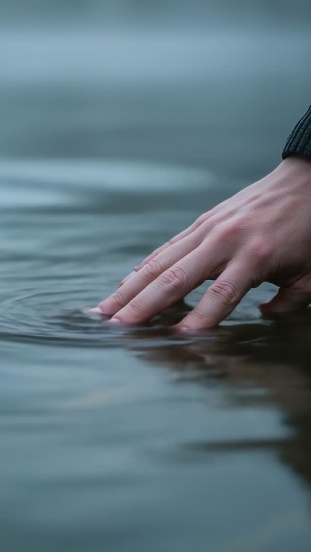 AI Generated Video. Showing close-up of hand fingertips gently touching calm lake surface, creating concentric ripples and soft reflection. Featuring vertical composition, shallow depth of field, moody cool tones and dark sleeve providing contrast, with generous copy space above for text overlays. Offering 9:16 framing and shallow focus, suitable for slow-motion playback, social reels and cinematic intros. Suited for mindfulness and wellness reels, nature and environmental content, spa and relaxation promos, brand storytelling, app intros and social media vertical ads. Working well as background layer for titles, lower thirds, cover screens, website hero headers, packaging and editorial layouts. Optionally warming color grade to evoke sunrise mood or keeping cool teal tones for contemplative atmosphere.