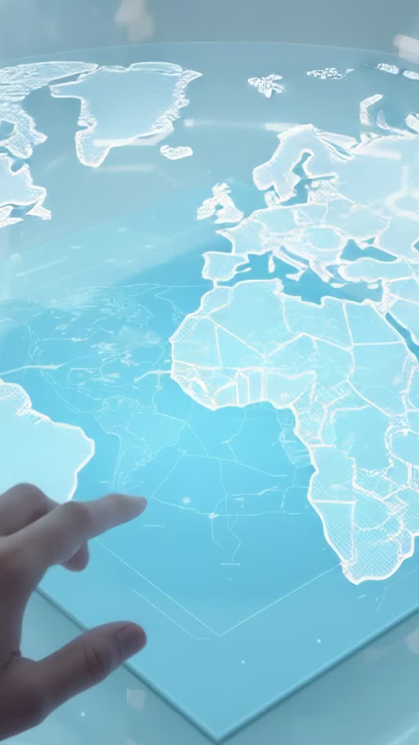 AI Generated Image. Showing hand touching holographic world map projected on transparent table, navigating routes and highlighting connectivity lines. Featuring bright blue holographic grid, clear country borders, subtle glow and copy space at top for titles or captions. Suitable for corporate technology presentations, app demos, navigation tutorials, logistics and shipping campaigns, telecom and network visualizations, travel and mapping services, startup pitch decks and futuristic advertising. Using vertical video format for mobile-first distribution on social channels, stories and app splash screens. Recommending overlaying logo and animated text in copy space, adding voiceover describing route or data, and using slow zoom or parallax for dynamic cut. Offering clean visual for explaining geospatial data, global logistics flows, AR interface concepts and interactive UX prototypes.