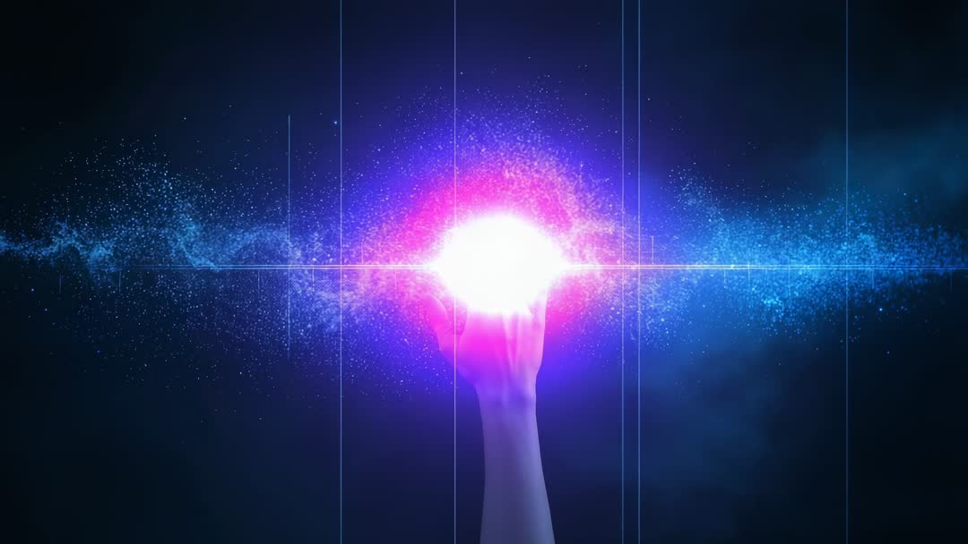Hand Touching Neon Energy Orb Amplifying Cosmic Waveform in Deep Space Video