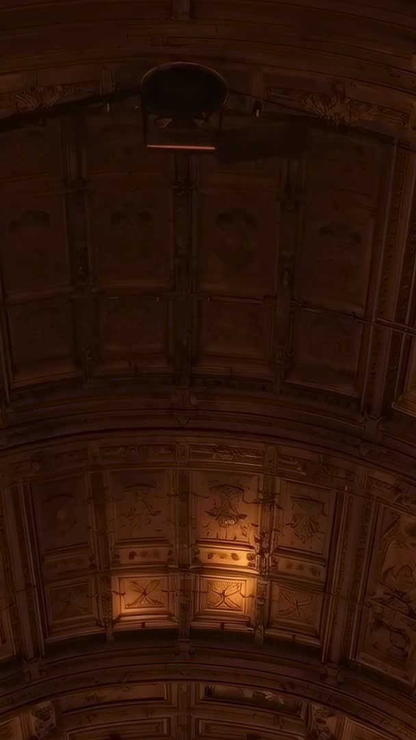 AI Generated Image. Showing handheld vertical footage tilting up to reveal ornate coffered vaulted ceiling with suspended projector bathed in warm amber light. Capturing architectural detail including carved panels, decorative plasterwork, and curved arch ribs. Featuring moody low-light atmosphere suitable for cinematic intros, theater tech demonstrations, museum tours, or historical restoration showcases. Providing vertical composition optimized for mobile platforms such as Instagram Reels, TikTok, and Stories. Suggesting use for background clip in event promos, venue listings, architecture reels, or projection mapping presentations. Recommending slow crossfade, subtle ambient soundtrack, and gentle warm color grade to enhance cinematic mood.