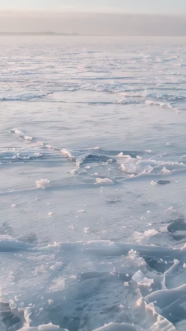 AI Generated Video. Video showing handheld vertical panning across frozen coastal sea, revealing fractured ice plates, ridged frost, hummocks and long cracks stretching toward low horizon. Soft pastel light at sunrise or sunset creating cool blue and pale pink tones, with textured foreground ice and distant flat horizon offering negative space for titles or captions. Footage offering natural ambient motion and subtle camera shake for authentic documentary feel. Ideal uses: establishing shots for Arctic or polar adventure sequences, climate change and environmental videos, winter travel promos, social media vertical ads, TikTok or Instagram Reels, mobile wallpapers, meditation or ambient background loops, broadcast B-roll for news and weather segments, scientific presentations and educational content. Technical notes: vertical 9:16 orientation suited for mobile-first platforms; handheld panning delivering organic motion and realistic perspective; composition leaving upper frame clear for overlaid text or lower thirds.