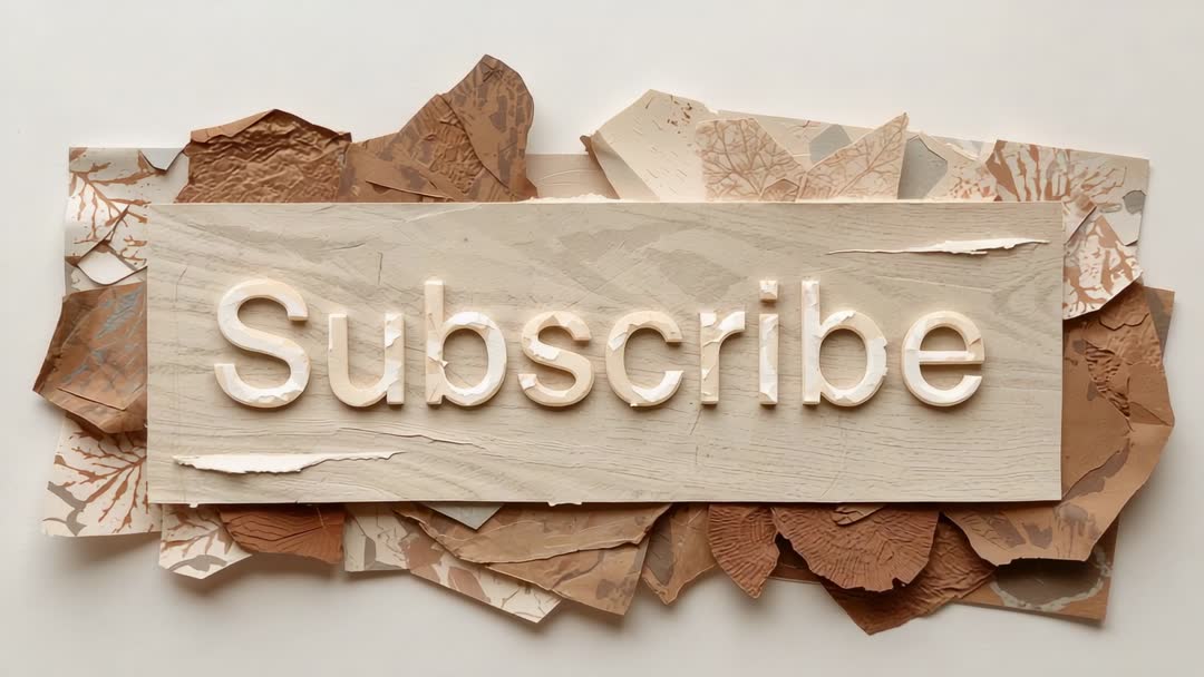 - Handmade papercraft Subscribe sign featuring torn paper collage and shifting light