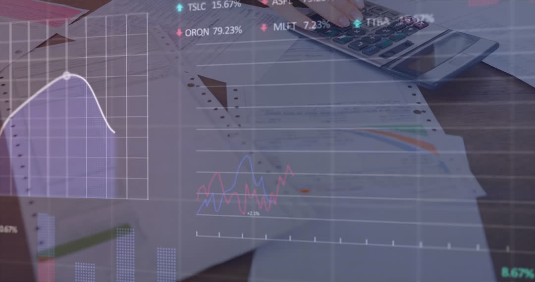 Hands using calculator with overlay of financial data and graphs, capturing essence of financial analysis and budgeting tasks. Ideal for depicting finance concepts such as personal budgeting, economic analysis, or investment strategy. Suitable for financial websites, economic blogs, and corporate presentations on budgeting or data-driven decision making.