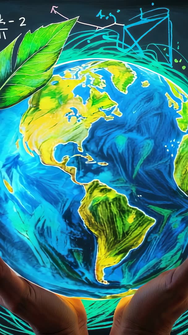 AI Generated Image. Vertical clip showing hands cradling rotating Earth globe over chalkboard mural with leaf motif, teaching map skills and environmental concepts. Colors and composition emphasizing Americas and vibrant ocean swirls, creating dynamic educational visual. Useful for geography tutorials, classroom intro clips, online course openers, social media reels, science outreach, sustainability campaigns, eco awareness content. Overlay text or icons for lesson titles, map labels, or call to action. Use as background for presentation opener, educational app demo, documentary segment. Crop and animate globe rotation for short-form sequences, transitions, or vertical ad placements.