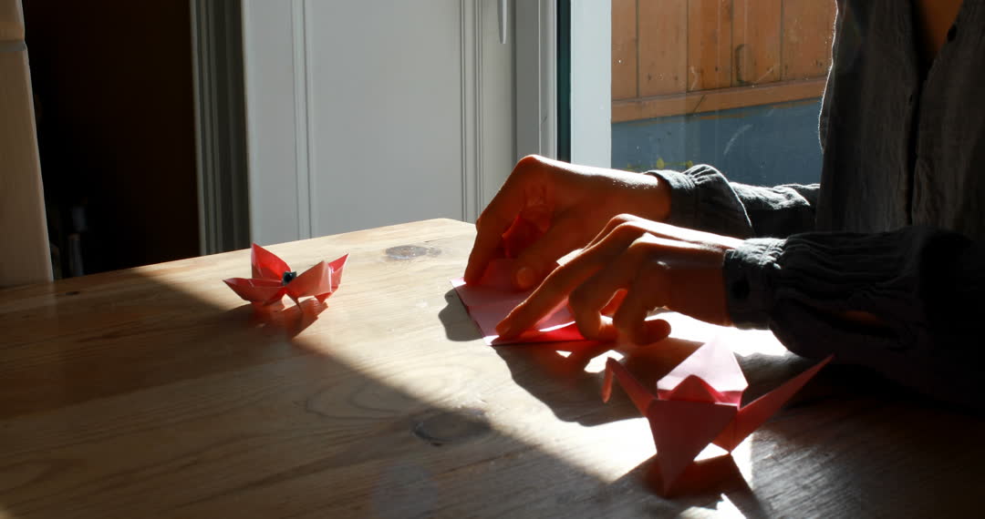 Hands folded creating origami figures on a wooden table bathed in soft sunlight, suggesting a serene hobby scene. This visual can suit articles about mental wellness and DIY crafts, illustrating focused artistic endeavors at home.