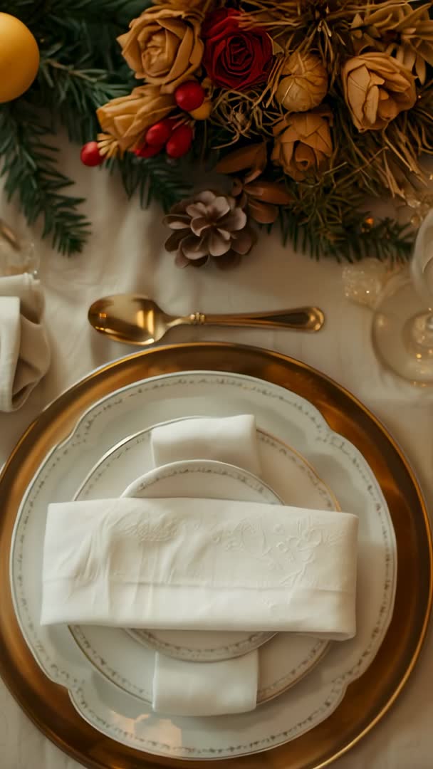 AI Generated Image. Vertical video showing hands folding and aligning white linen napkin over fine china placed on gold charger. Centerpiece featuring dried roses, red berries, pine branches and pinecone creating warm festive atmosphere. Lighting casting soft golden highlights on gold flatware and porcelain. Footage focusing on slow tactile movements, elegant table detail and luxury holiday styling. Usage ideas: Featuring in lifestyle and hospitality campaigns, social media reels for holiday entertaining, step-by-step table styling tutorials, ecommerce product pages for napkins and chargers, wedding and event planning content, restaurant promotion and seasonal catalogs. Slow motion and close-up cuts highlighting texture and craftsmanship for advertising, blog headers, gift guides and invitation video clips.