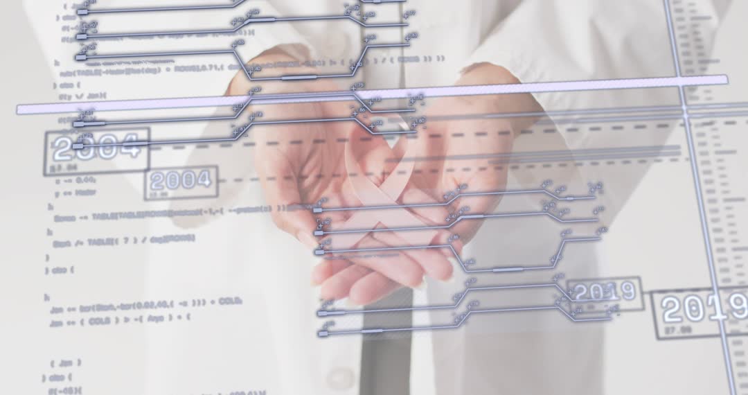 Hands embracing a dynamic digital display of medical advancements show progression from past to future. A significant element like a pink ribbon suggests a healthcare context, perhaps in cancer awareness. Use this for concepts highlighting growth, data evolution, or sophisticated healthcare systems.