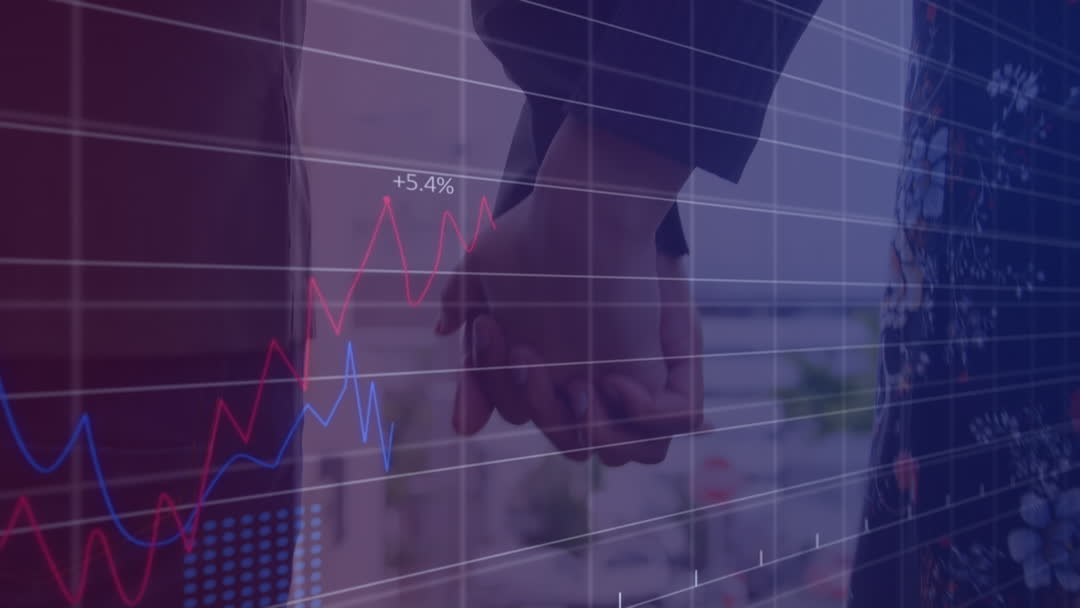 Depicts intertwined hands symbolizing connection and growth overlaying financial graphs indicating prosperity. Suitable for themes of partnership in business, investment growth opportunities, and collaborative financial planning. Ideal for websites, presentations on partnerships and financial market insights.