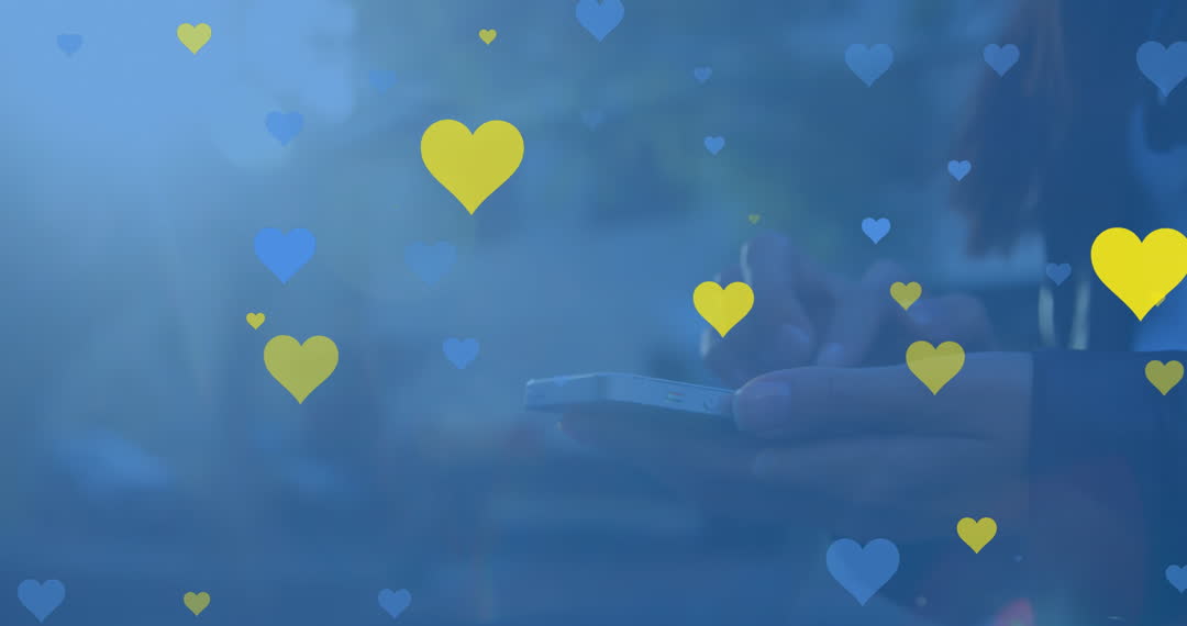 Hands gently touch a smartphone amid floating blue and yellow hearts, highlighting the connection of digital communication and social interaction. Perfect for representing online connectivity, modern dating, social media use, or digital marketing. Supports visual concepts related to love or messaging in today’s tech-driven world.