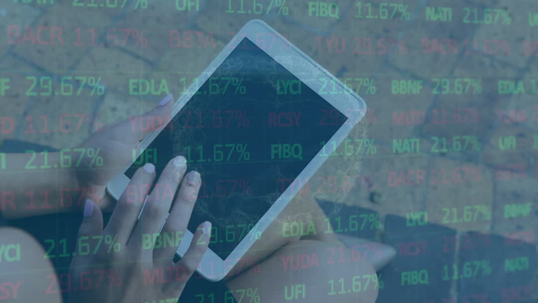 Hands Holding Tablet Overlapping Stock Market Data Video