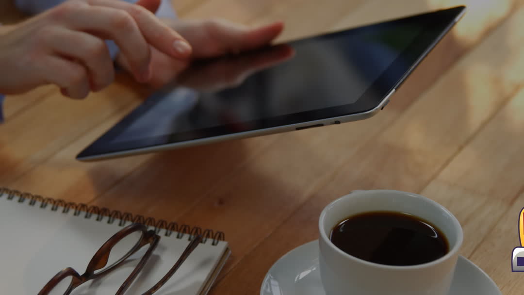 Hands are seen holding a tablet over a wooden desk, accompanied by a cup of coffee, a pair of glasses, and a notebook. This scene suggests a quiet moment of digital connectivity and productivity, taking place in an office or home office setting. This video is ideal for promoting technology, relaxation, productivity, or morning routines. Useful for websites or articles focused on digital communication, professional workspaces, or lifestyle blogs about balancing work and relaxation.