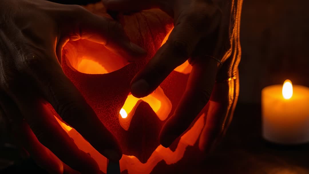 - Hands placing tealight inside glowing jack-o-lantern at candlelit table