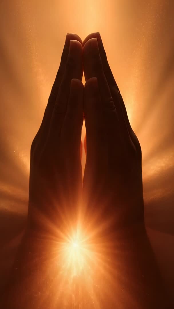 AI Generated Video. Silhouette hands pressing together with ring, warm light emerging between palms and radiant sunburst flare casting halo and rays. Composition emphasizing vertical frame and cinematic backlight, creating sense of peace, devotion, inner energy, and healing. Working well for meditation app intro, spiritual social posts, wellness and mindfulness ads, religious service promotions, yoga studio branding, energy healing therapy brochures, inspirational quote backgrounds, cinematic title sequences, and guided meditation videos. Delivering dramatic warm tones, soft grain, and high contrast silhouette, suiting projects needing serene, sacred, or mystical visual language.