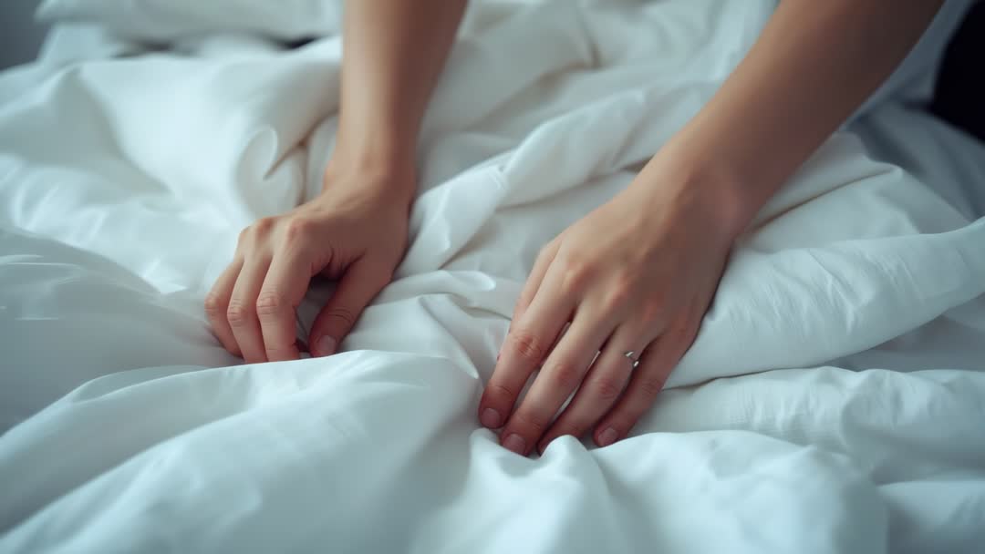 - Hands Smoothing White Duvet During Morning Routine, Intimate Closeup of Bedding