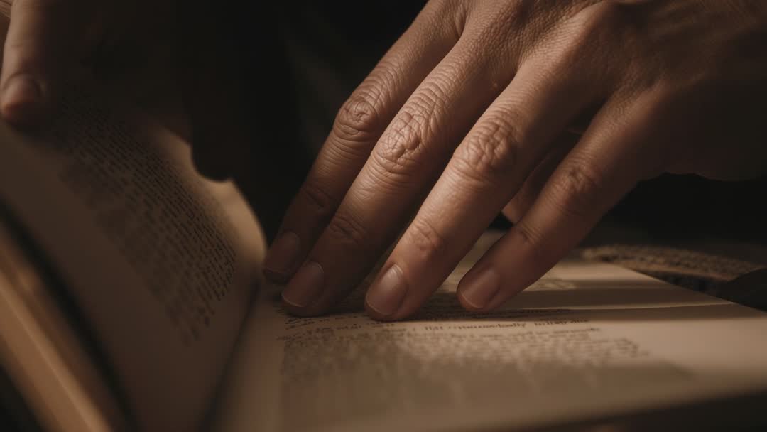 AI Generated Image. Showing closeup of hands turning book page under warm lamp light, highlighting paper grain and fingertip contact along gutter. Creating moody, intimate atmosphere ideal for narrative storytelling, study scenes, and quiet lifestyle content. Working well for book trailers, author interviews, library promotions, reading campaigns, online course intros, mindfulness content, and social media reels. Shot with shallow depth of field and low-key lighting to emphasize texture and motion; consider slow motion for dramatic page flip. Color grading suggestions include warm tones, soft shadows, and slight film grain for vintage look.
