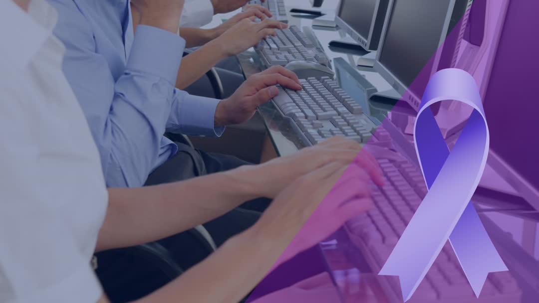 - Hands Typing at Office Desks with Cancer Awareness Ribbon