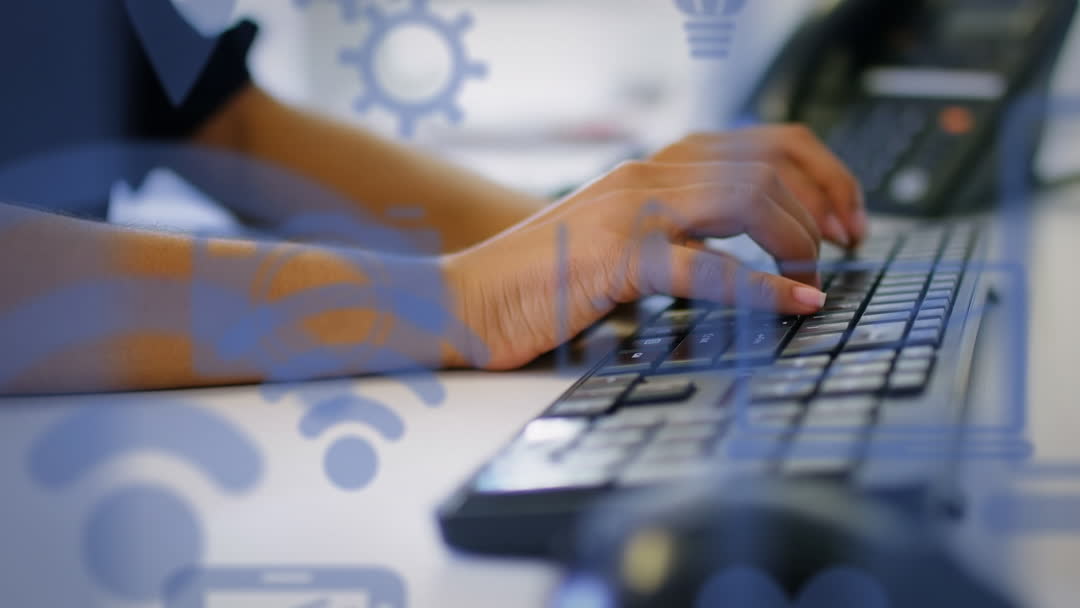 - Hands Typing on Keyboard with Futuristic Digital Icons Overlay