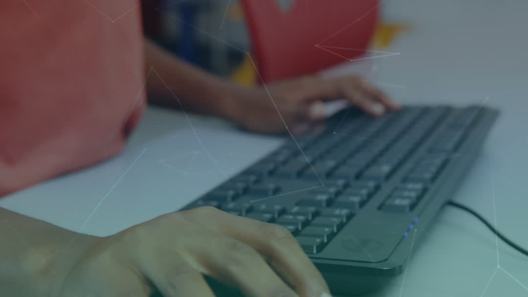 Close-up of hands typing on a computer keyboard with a semi-transparent digital network overlay. This video is ideal for illustrating concepts related to educational technology, digital literacy, and communication skills in a school setting.
