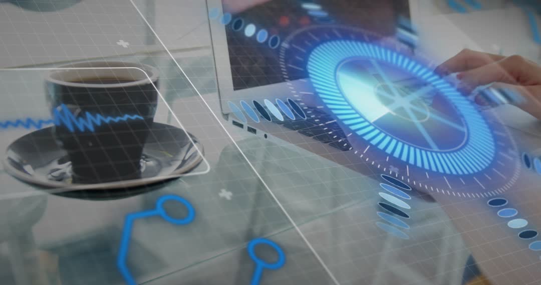 This clip showing hands typing on laptop keyboard while spinning blue holographic UI wheel overlaying screen and dashboard graphics. Cup of coffee on saucer sitting beside laptop adding human touch to high-tech scene. Glass desk reflecting interface elements for layered, immersive look. Use for technology presentations, website hero banners, startup pitch decks, fintech and cybersecurity promos, app onboarding sequences, UX demo reels, corporate training videos, social media ads and background b-roll. Crop for 16:9 or 4K frames, loop spinner animation for subtle motion background, apply color grade to enhance cool blue tones and increase contrast between hologram and real-world objects. Suitable for illustrating digital transformation, interface design, data analytics, virtual control concepts and modern office productivity.