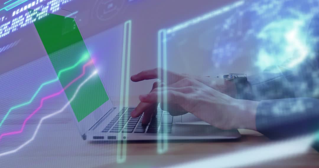 - Hands Typing on Laptop While Holographic Data Streams Visualizing Real-Time Analytics