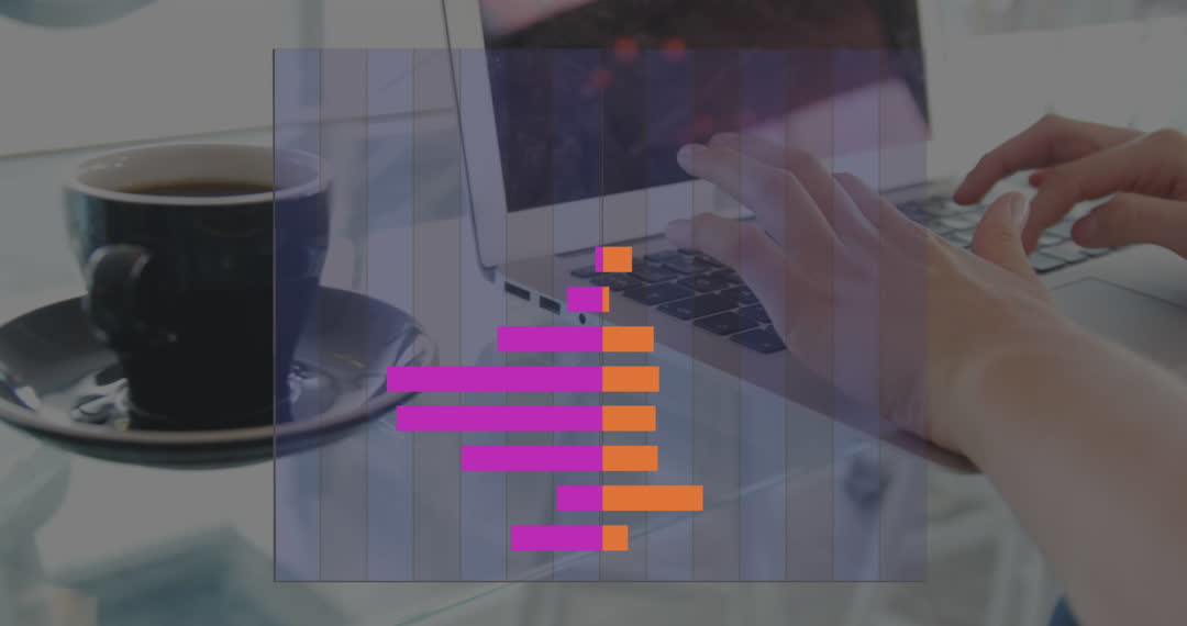 Overlay of digital data analytics intermixed with a person's hands typing on laptop keyboard. Concept of technological advancement in business and modern global connectivity. Suitable for representing topics about data science, digital communications, remote work or technological innovations in marketing and management fields.