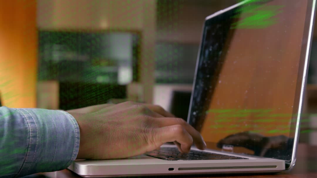 Image portrays hands typing on a laptop with a visual overlay of digital data or code streaming across the screen. Ideal for illustrating tech stories, articles on digital security, cyber innovations, or technology-focused presentations and websites.