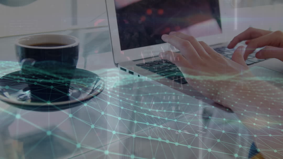 A visualization shows hands working on a laptop keyboard with an overlay of digital data processing, symbolizing advanced technology, digital interfaces, and global connections. The coffee cup represents a work or study environment. Ideal for illustrating concepts in technology, education, business innovation, and networking in digital workplaces.