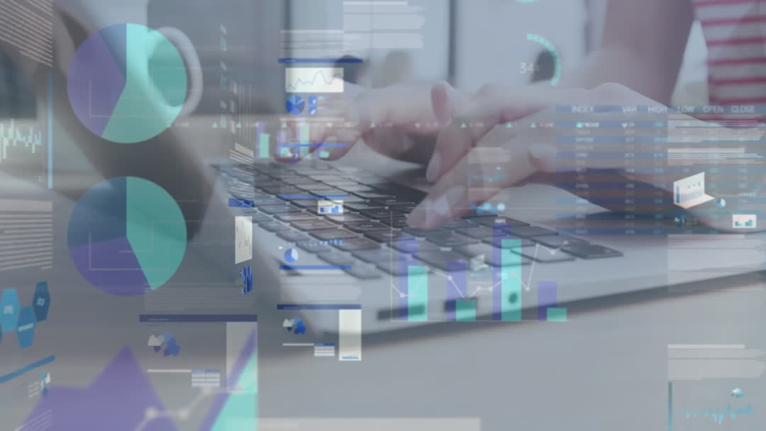 This video shows a woman's hands typing on a laptop with an overlay of graphs and data analytics. It conveys a hi-tech and corporate feel, indicating modern strategies and using data-driven insights. Ideal for technology-focused articles, business presentations, or content about innovation in data analytics and tech industries.