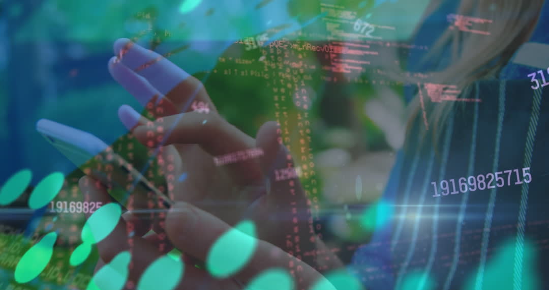 - Hands Typing on Smartphone with Data Processing Overlay