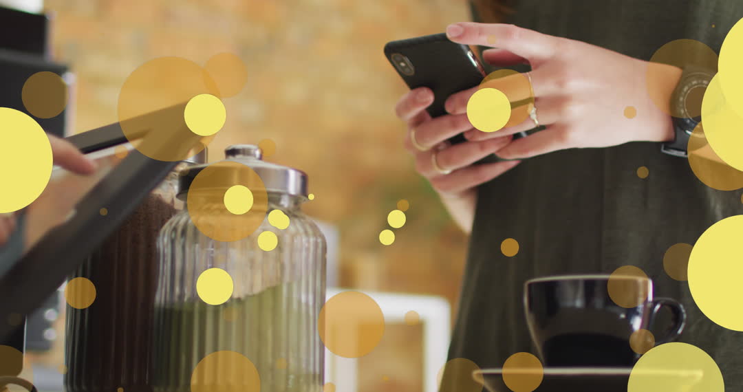 - Hands Using Mobile Payment at Coffee Shop with Digital Graphics Overlay