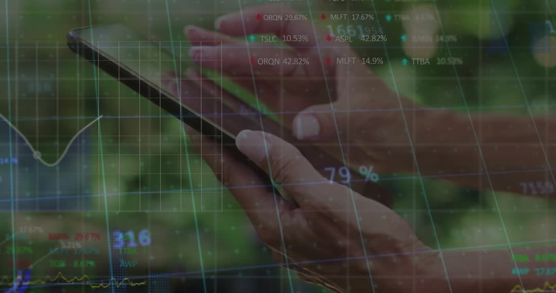 - Hands Using Smartphone with Financial Data Overlay Outdoors