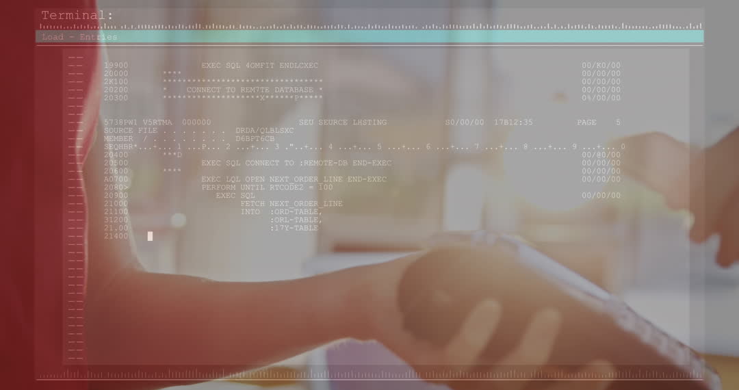 Hands are depicted using a contactless payment system with data processing visuals overlaying the scene, giving a futuristic feel. Suited for illustrating advanced financial transactions, technology in retail, or digital innovation applications.