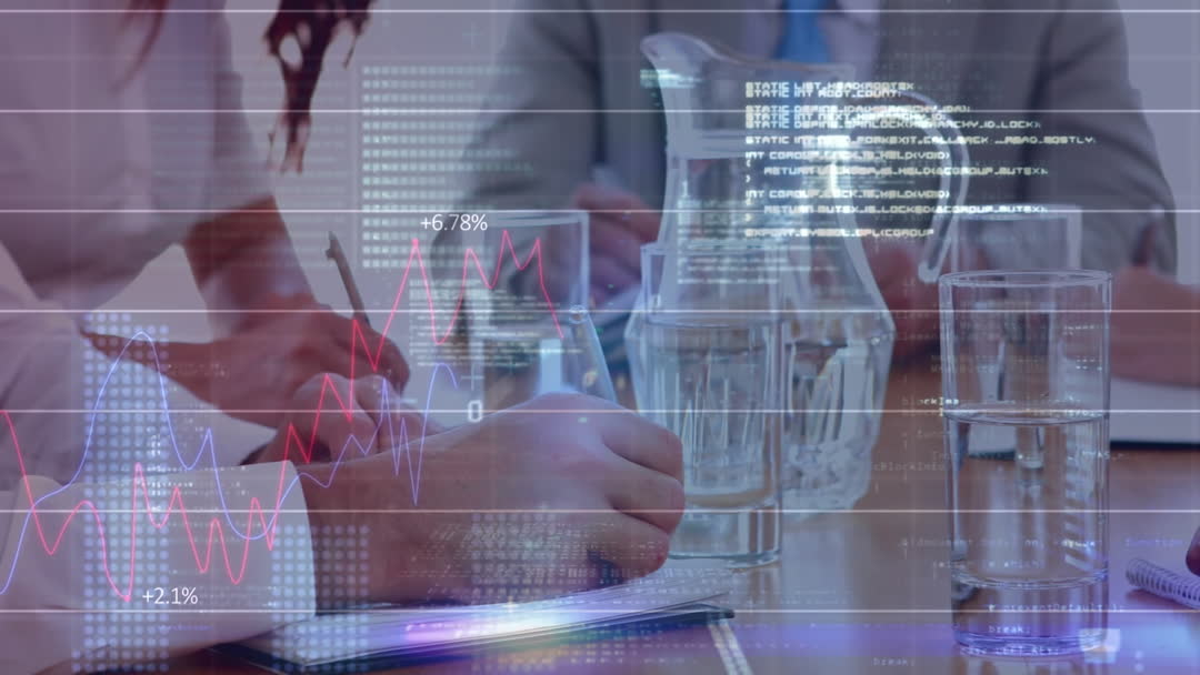 A person taking notes at an office meeting with a digital overlay of financial graphs, reflecting a blend of traditional practices and modern technology. This photo is suitable for illustrating themes like financial analysis, data-driven decision-making, and technology deployment in corporate environments. Ideal for use in corporate brochures, presentations, and online articles focused on business innovation.