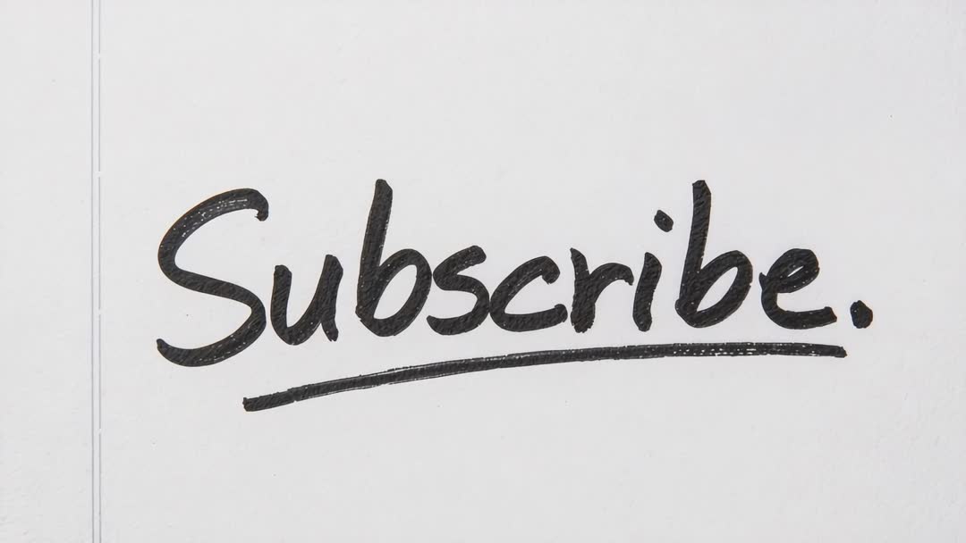 AI Generated Image. Showing single video frame featuring handwritten "Subscribe" underlined with bold black marker on white paper, closeup including notebook seam at left. Providing high contrast strokes and textured marker lines for authentic handcrafted feel. Working well for video end screens, channel outros, social media promos, email campaigns, blog banners, and digital ads. Suggest pairing with animated subscribe button, lower third graphic, or applying simple motion blur to draw attention. Recommend cropping for square or vertical formats, adjusting contrast for print, or overlaying brand colors for cohesive look. Serving creators, marketers, influencers, small businesses, and educators wanting clear call to action.