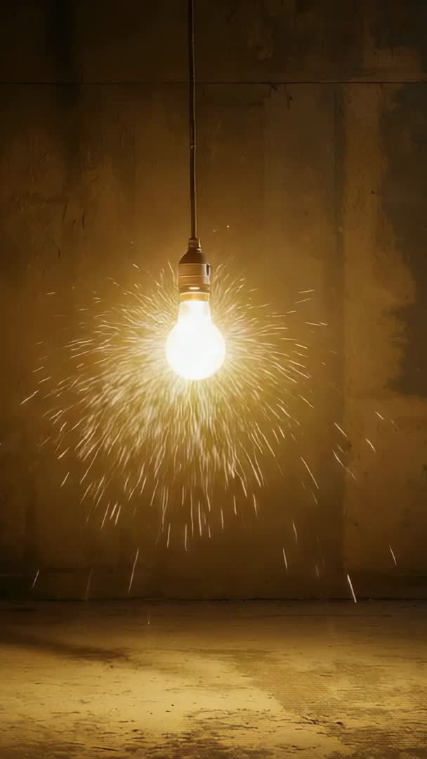 AI Generated Image. Vertical video showing hanging light bulb glowing and emitting sparks against rough concrete walls. Floor glowing and embers falling, creating moody industrial ambiance and vintage warmth. Visual working well for energy campaigns, innovation concept pieces, industrial design promos, music video backgrounds and vertical social ads. Use ideas include background for title cards, motion graphics, product launches, technology concept videos, power outage or surge narratives, and cinematic openers. Editing tips: apply slow motion and seamless loop for continuous background, use warm color grading to intensify glow, add subtle crackle and falling ember sound effects for realism, increase contrast and add vignette to emphasize sparks. Delivery suggestions: crop for 9:16 mobile formats, overlay bold text for promos, mute or replace audio for custom soundtrack. Licensing note: suitable for commercial and editorial use under standard stock licensing.