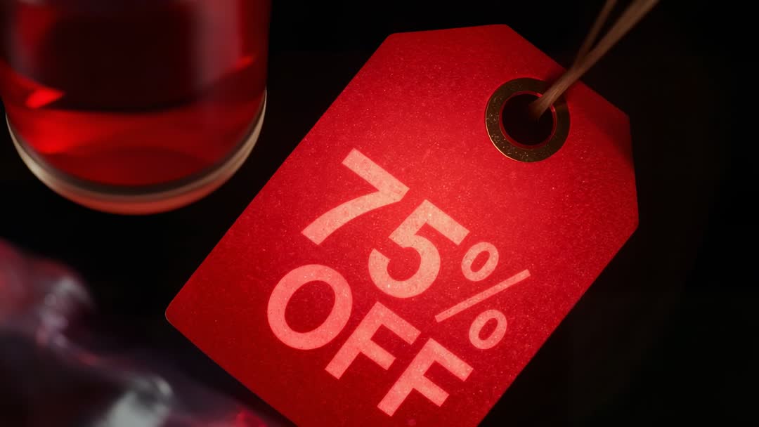 AI Generated Image. Video showing red price tag with bold "75% OFF" typography, hanging from string and brass grommet while glass is entering frame left creating bright reflections and subtle refractions. Composition is focusing on closeup detail, shallow depth of field, and saturated red tones with dramatic low-key lighting that is drawing attention to discount message. Clip is working well as short loop or slow reveal for promotional spots, ecommerce landing pages, social media ads, email headers, digital signage, and Black Friday or seasonal clearance campaigns. Creative suggestions include overlaying animated call-to-action text, adding countdown timer, applying punchy color grade to enhance red, and using 16:9 for website hero, 1:1 for feed posts, 9:16 for stories and reels. Mood is urgent and premium while keeping focus on value proposition, making clip ideal for conversion-driven marketing and retail advertising.