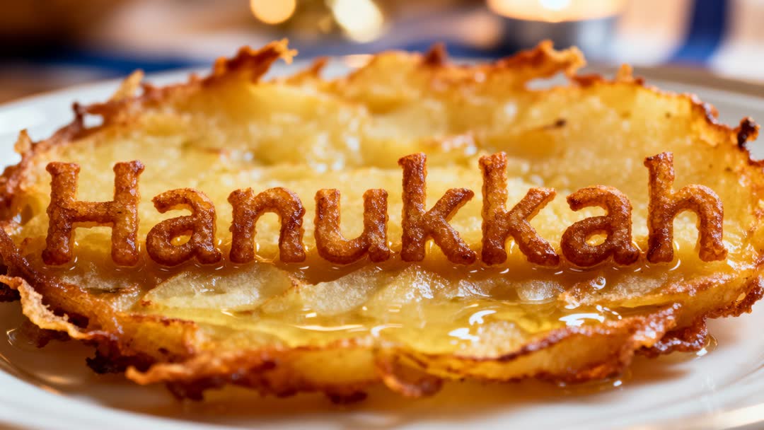- Hanukkah Latke Sizzling on Plate with Honey Drizzling and Warm Candlelight Bokeh