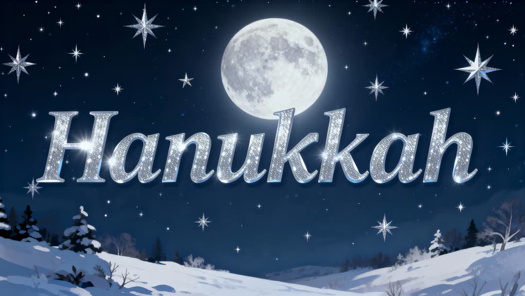 AI Generated Image. Video showing Hanukkah lettering shimmering over snowy hillside under full moon, stars twinkling and glittering sparkles drifting across letters. Scene featuring slow camera pan across snow-covered trees, soft moonlight glow, and subtle star twinkle, creating calm festive atmosphere. Perfect for creating holiday greeting videos, enhancing social media posts, composing e-cards, promoting community events, and producing store window projections. Delivering loopable clip suitable for widescreen and mobile crops, with central text area for overlaying additional messages and branding.