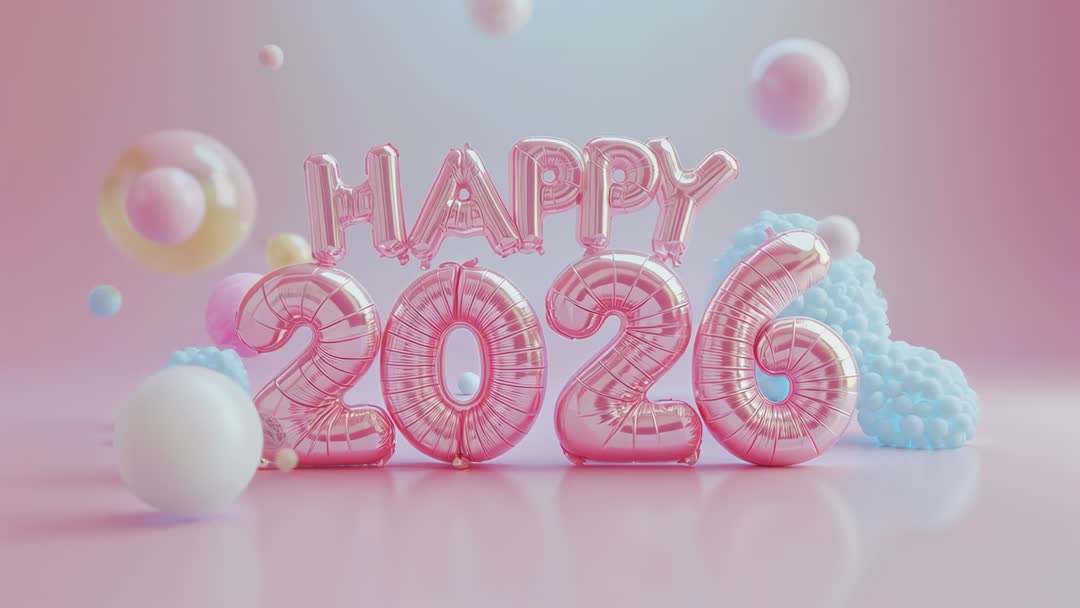 AI Generated Video. Looping 3D video showing Happy 2026 foil balloons floating on glossy mirror floor, surrounded by pastel spheres and cloud-like clusters. Soft pink and blue palette creating dreamy celebratory mood with reflective highlights and cinematic lighting. Perfect for New Year promotions, social media countdowns, party invitations, event openers, retail window displays, greeting cards, website hero banners, digital signage. Clip working well for looping backgrounds, overlaying text or brand logo, pairing with upbeat music. Recommended edits: trimming loop points, adding subtle motion blur for realism, color grading to match brand palette, inserting text animation in negative space. Delivering modern playful vibe suitable for lifestyle, retail, holiday campaigns.