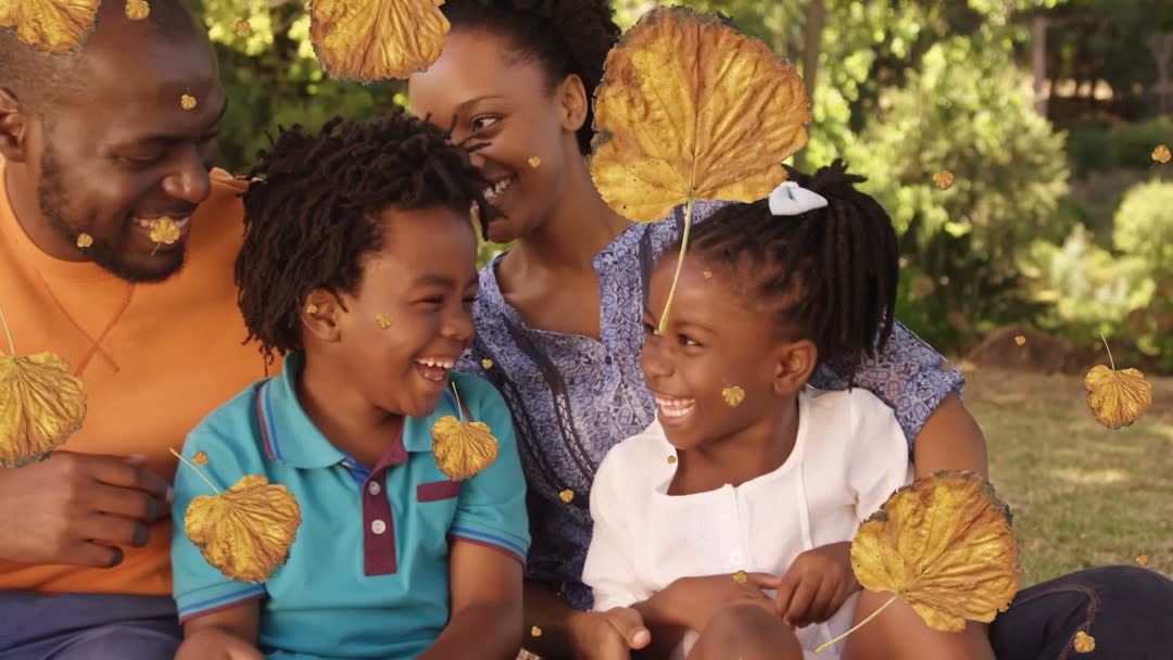 Smiling African American family sitting outdoors with falling leaves on a sunny autumn day. Ideal for illustrating family bonding, joyful outdoor experiences, or seasonal promotions. Suitable for use in marketing materials, websites, or family-centric content highlighting togetherness and outdoor leisure.