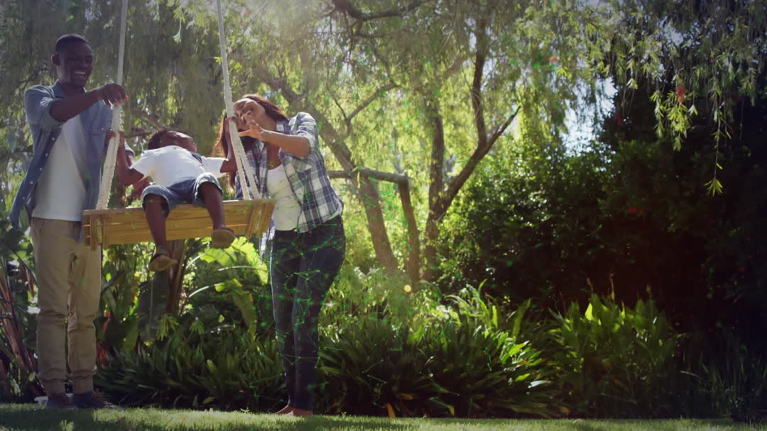 A joyful African American family spending quality time together outside. The parents guide their child on a backyard swing amidst lush greenery. Perfect for themes of family togetherness, outdoor fun, parenting, and nature.