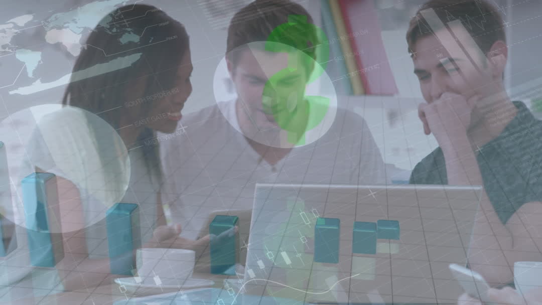 This video shows a diverse group of colleagues focused on a project, with overlays of graphs and data charts representing analytics and digital trends. It conveys themes of teamwork and productivity, ideal for illustrating business presentations, company websites, or educational materials on digital transformation and data analysis.
