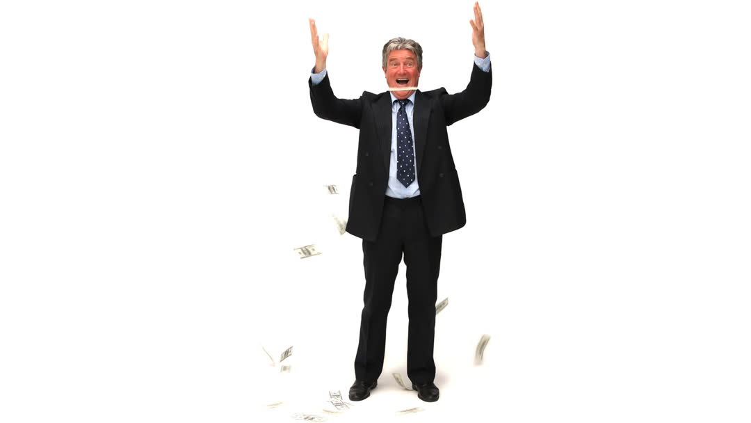 Mature businessman joyfully celebrating as cash floats around him, conveying success and financial gain. Suitable for articles, ads, or blogs about financial success, wealth management, or business achievement.
