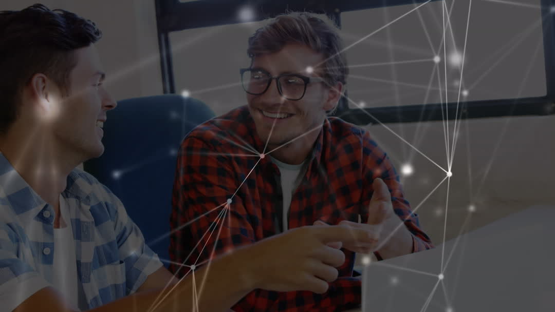 Two Caucasian men in casual attire engaging in friendly discussion at office setting with digital network overlay illustrating technological communication. Suitable for content focusing on modern workplace dynamics, collaboration, digital innovation, and professional relationships in tech-driven environments.