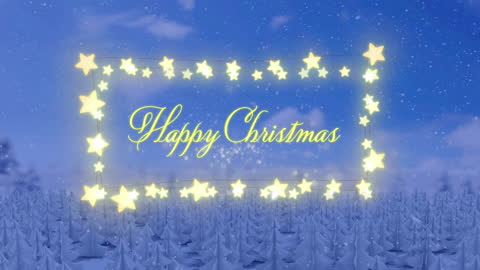 - Happy Christmas in Glowing Fairy Lights Over Snowy Forest Landscape