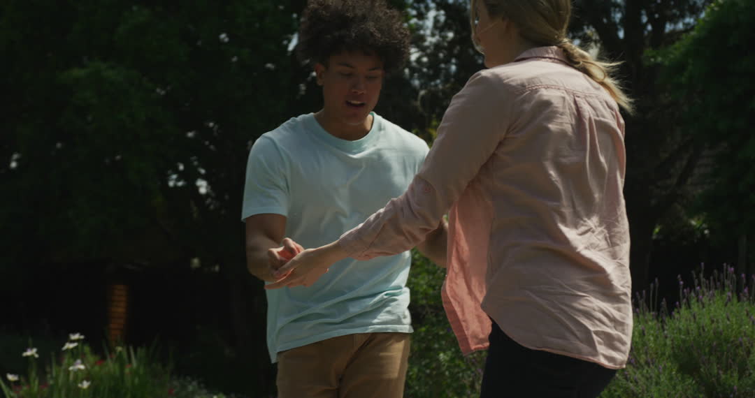 A diverse couple enjoys dancing in a sun-drenched garden, expressing happiness and connection. Perfect for themes of love, companionship, or outdoor leisure activities.