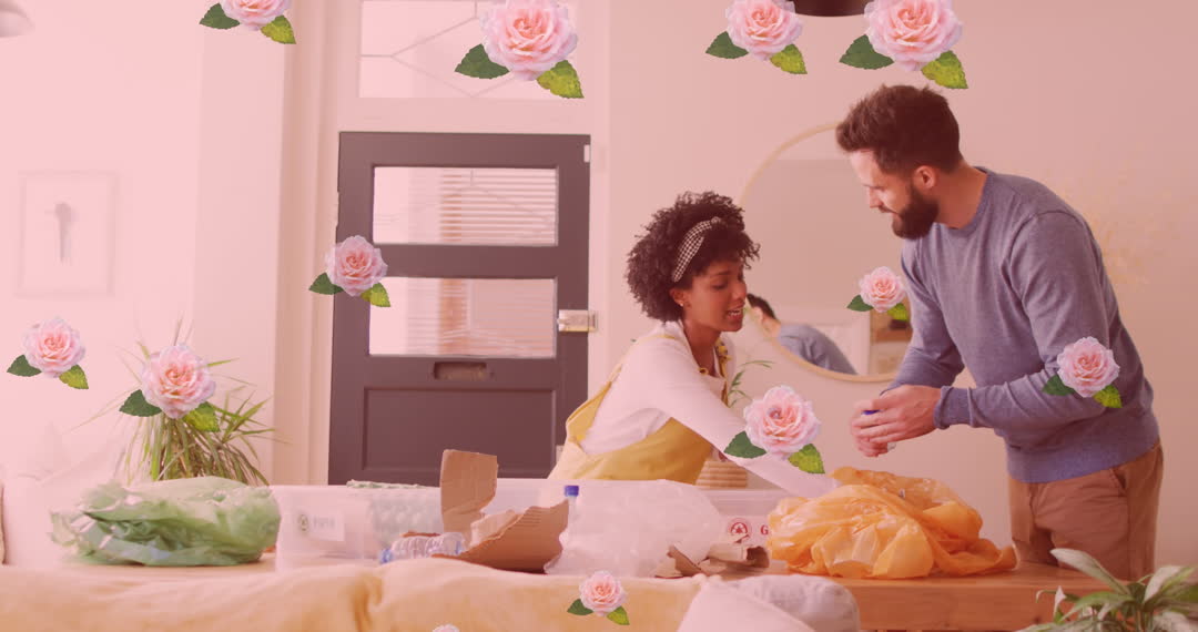 A couple engaging in a recycling activity at home surrounded by blooming flowers, indicating happiness and a commitment to sustainability. Ideal for illustrating topics on eco-friendly living, domestic teamwork, and environmental consciousness. Useful for articles promoting recycling habits and sustainability tips within households.